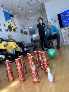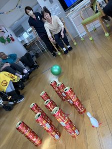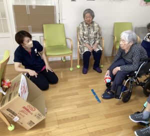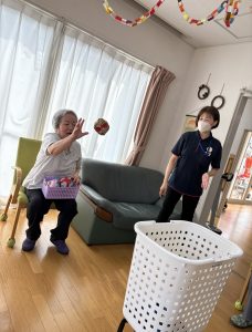 今回の運動会では、輪投げや玉入れ、ボーリング、 柿送りゲームなど、利用者様お一人おひとりが無理なく、 そして楽しめる競技を考えました。